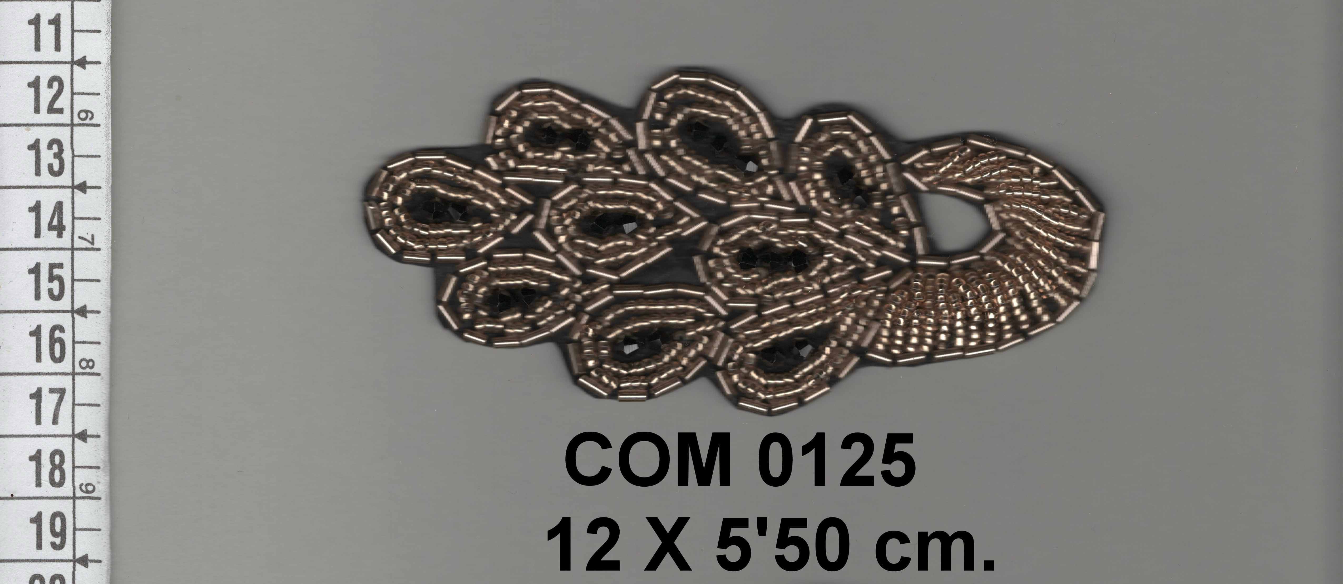 Aplicación con cuentas y cristales tubulares color oro rosa con piedras negras.