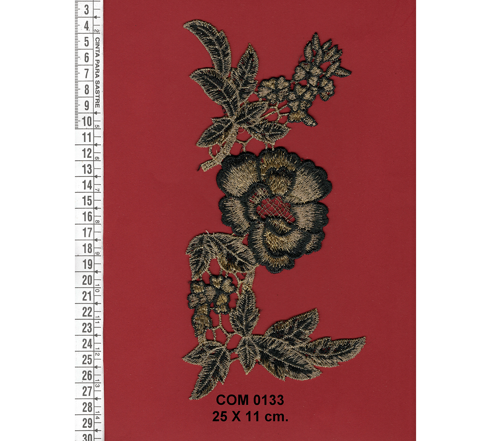 Aplicación de flor bordada en oro y negro.