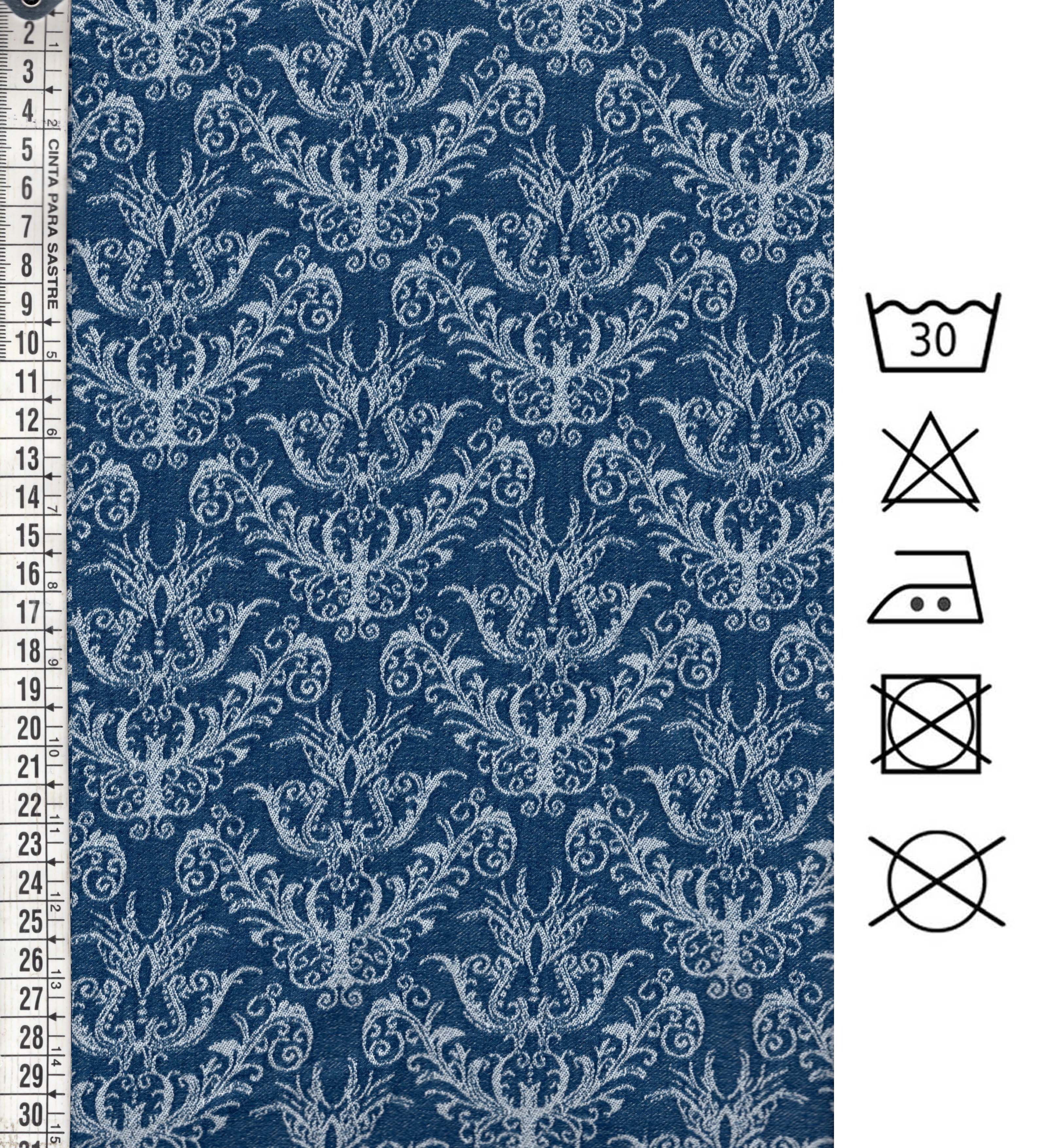 Tejido jacquard con fondo índigo y motivos ornamentales color crudo. Muy apropiado para confeccionar prendas vaqueras con estilo.