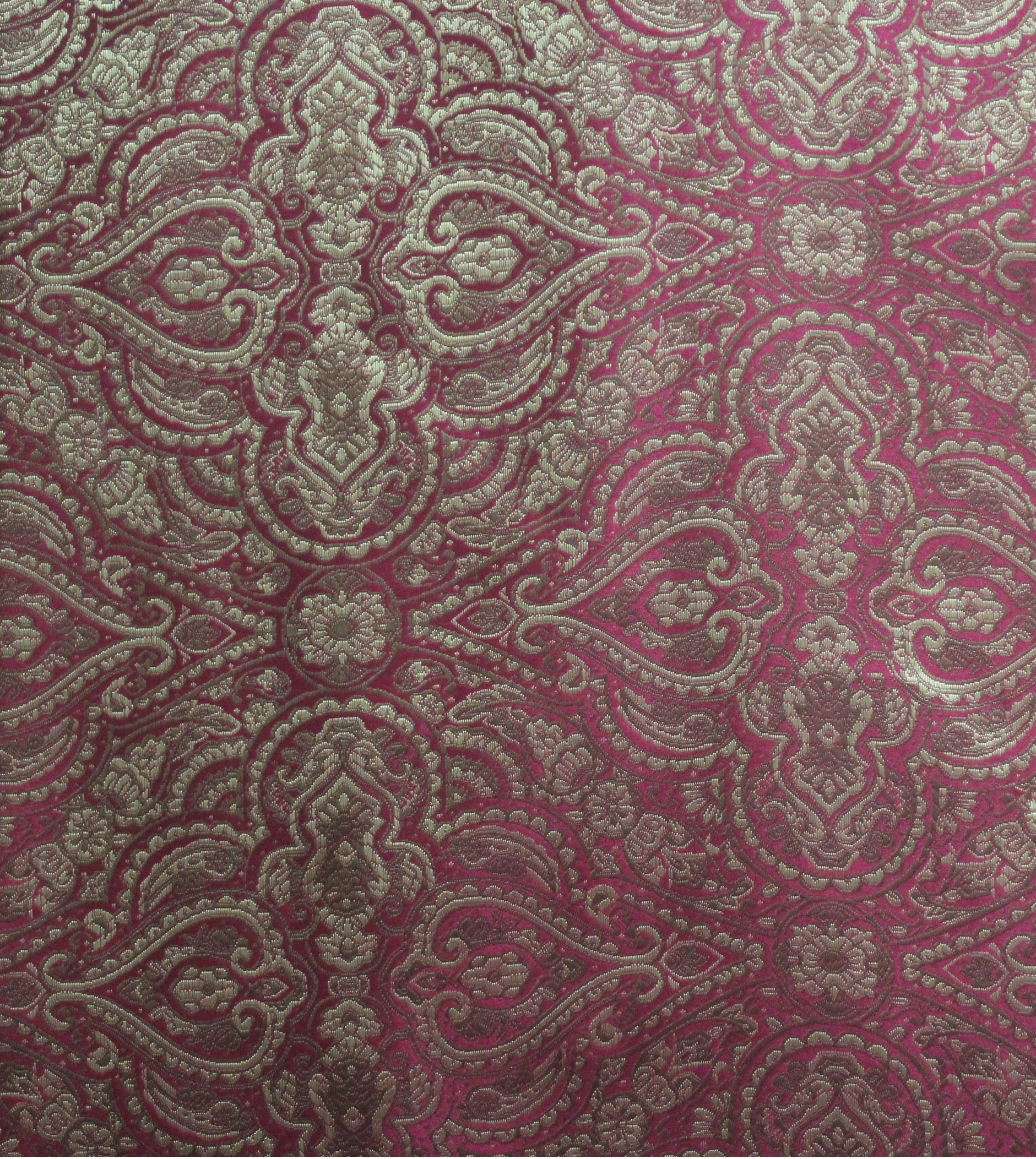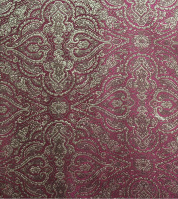 Tejido jacquard con fondo rojo y motivos ornamentales de cachemiras en color oro. Apropiado para uso eclesiástico, decoración...
