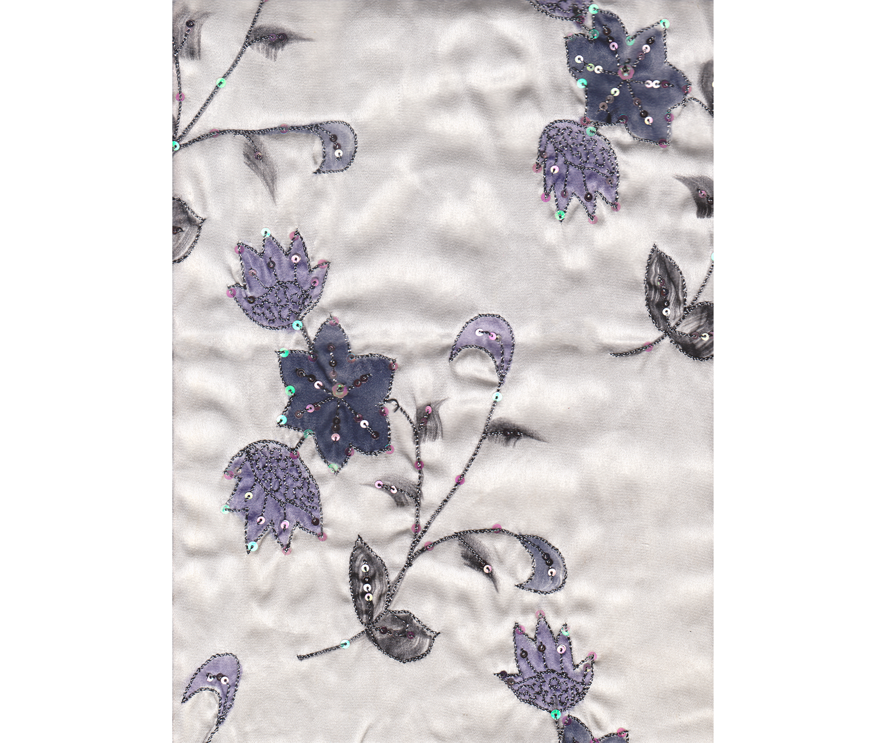 Pieza de satén de seda natural blanco bordado con hilos de seda metálicos, lentejuelas y cristales. Las flores y hojas están pintadas a mano en gama de tonos grises y violetas.