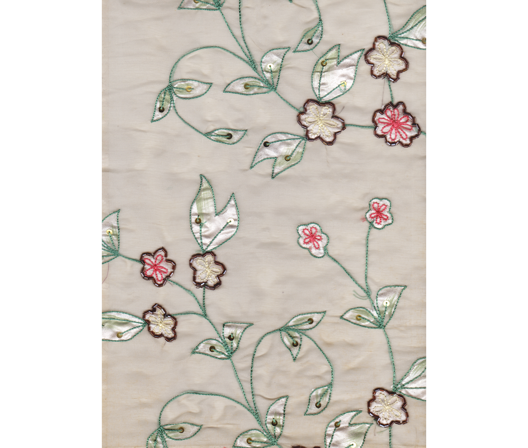 Pieza de organza de seda beige tostado,bordada con flores de cordoncillo color verde, beige y rojo, cuentas tubulares cobre y pequeñas lentejuelas doradas. Pintada a mano.