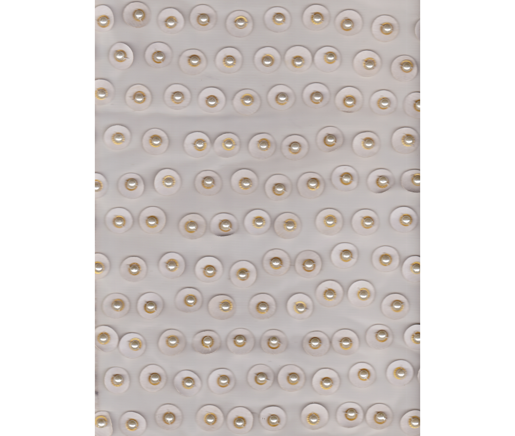Pieza de tul blanco con aplicaciones circulares de cuero en el mismo color, arandelas doradas y perlas.