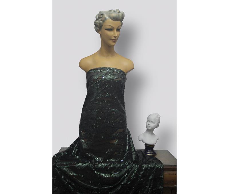 Tejido de tul negro bordado con lentejuelas de 4 mm de diámetro, color verde botella, formando ramajes. Muy adecuado para ceremonia y momentos especiales.