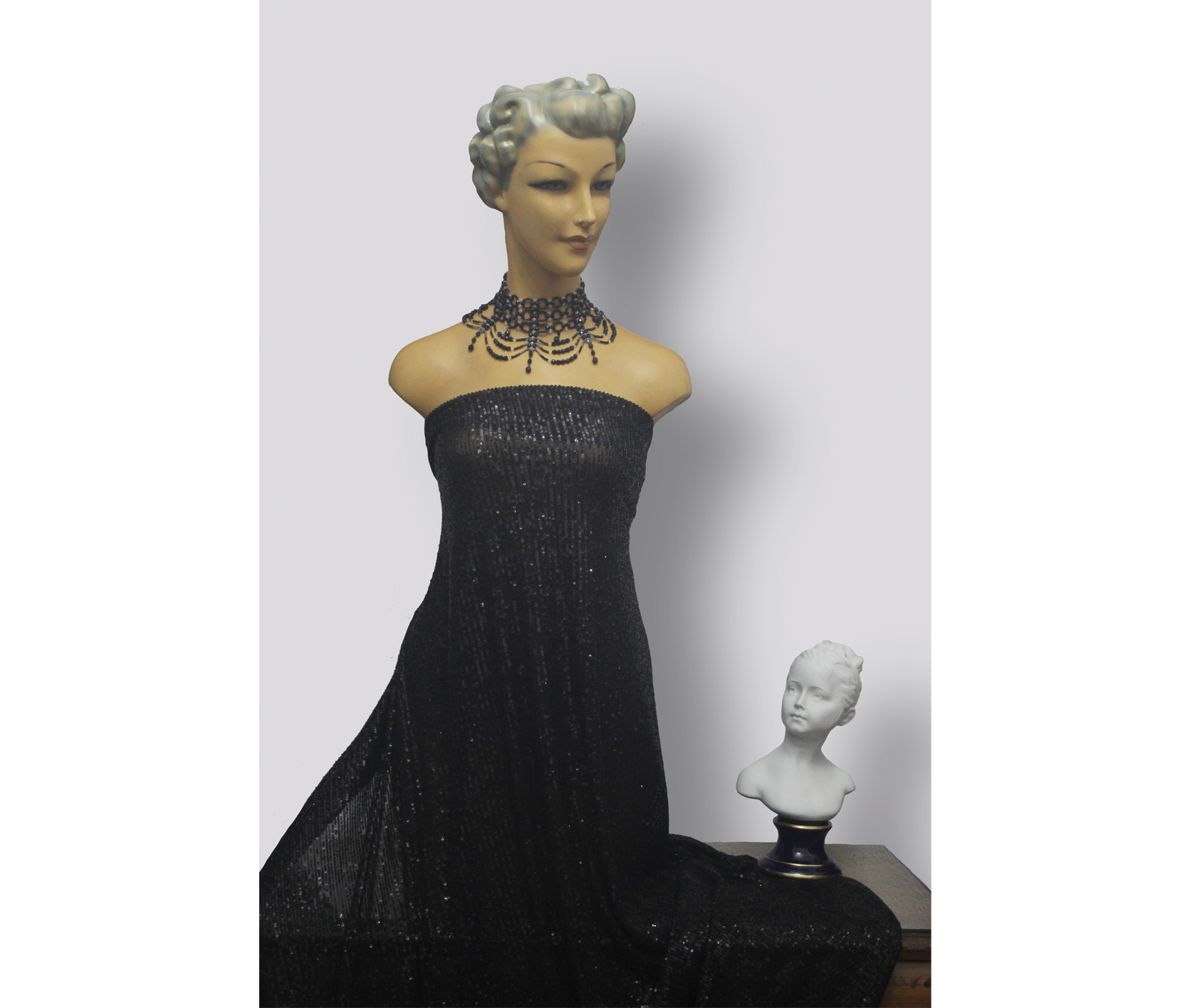 Tejido de tul negro cubierto totalmente de lentejuelas circulares negras de 2 mm de diámetro. Apropiado para ceremonia, espectáculo y momentos especiales.