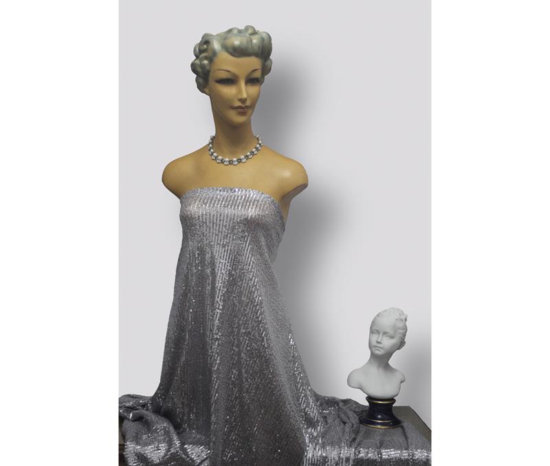 Tejido de tul color gris humo cubierto totalmente de lentejuelas circulares plateadas de 2 mm de diámetro. Apropiado para ceremonia, espectáculo y momentos especiales.