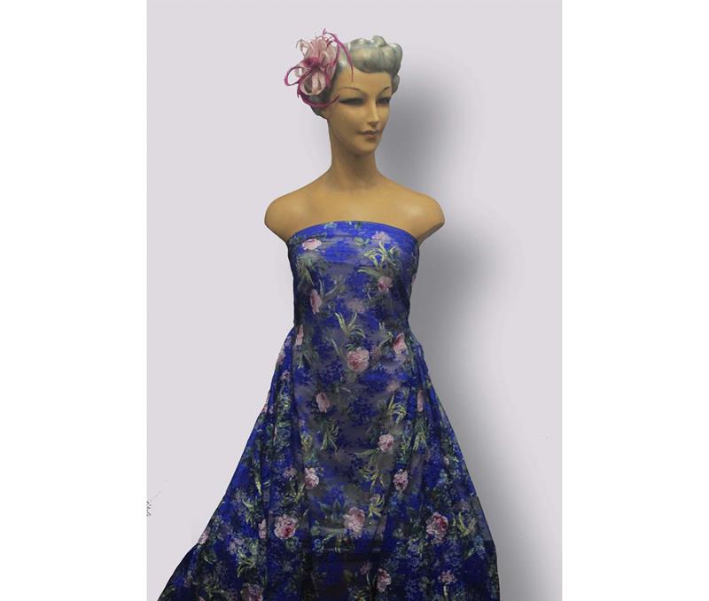 Encaje Chantilly de color azulina con estampación floral en tonos de rosa y hojas verdes. Blondas recortables protegidas. Apropiado para ceremonia, trajes de flamenca... El tocado es de DTE.