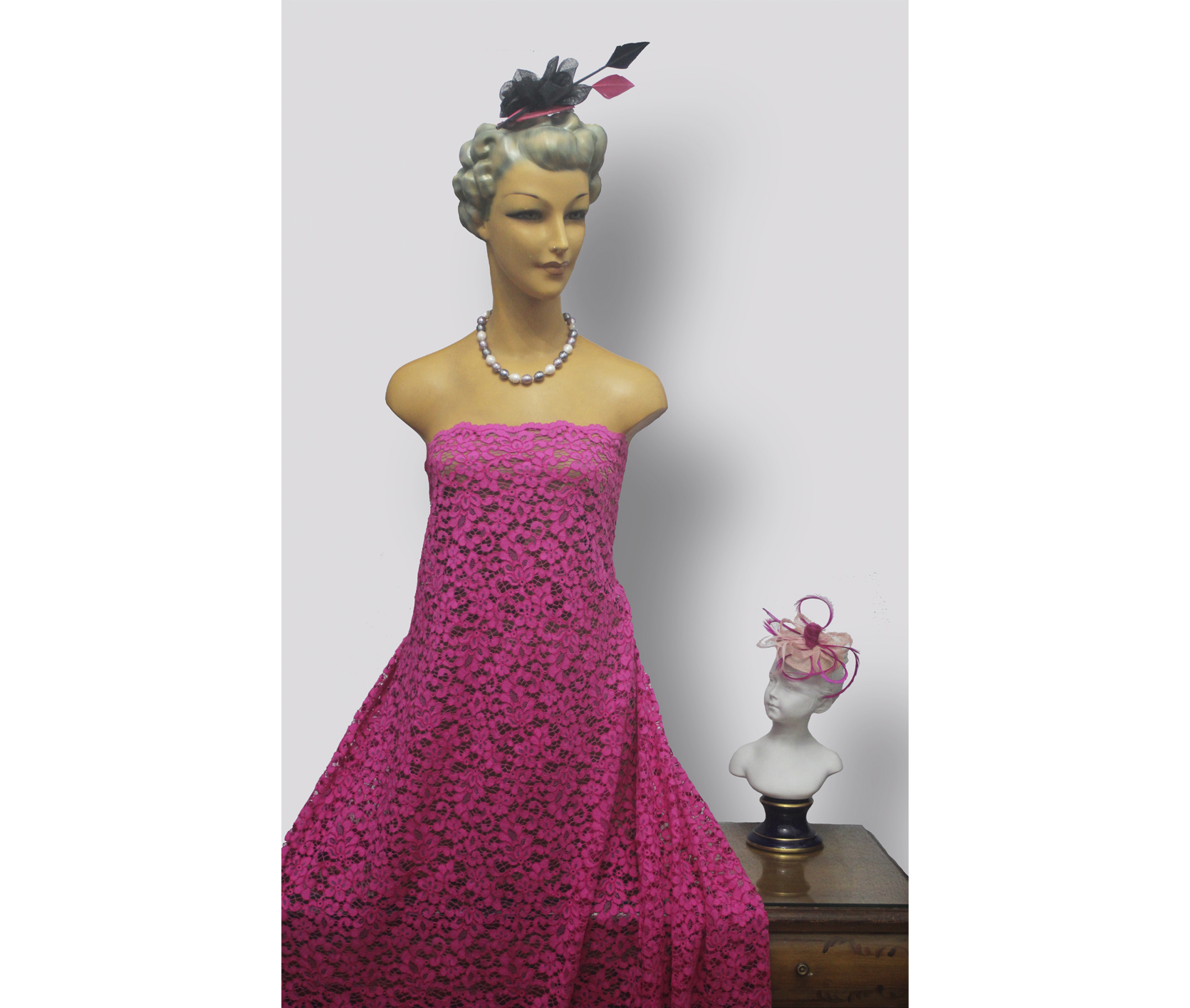 Encaje guipur con flores y hojas en color fucsia, con blonda en ambos lados. Recomendado para ceremonia, trajes de flamenca... Los dos tocados que aparecen en la imagen son de DTE.