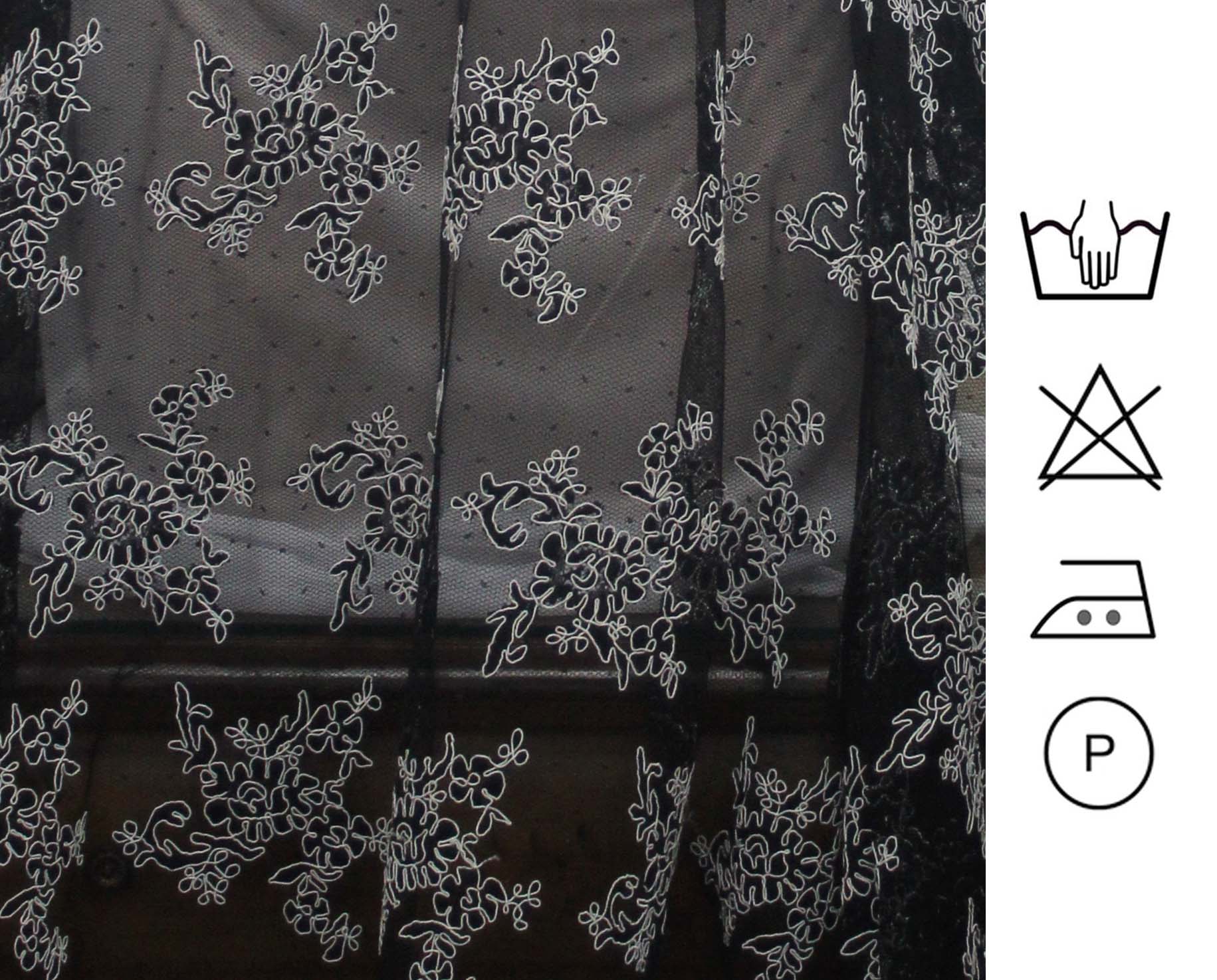 Encaje plumeti en color negro, bordado con cordoncillo blanco de algodón formando flores. Blonda en ambos lados. Adecuado para ceremonia, vestidos, vestimenta de imágenes religiosas... El maniquí lleva una gargantilla de seda y azabache de DTE.