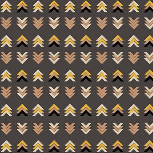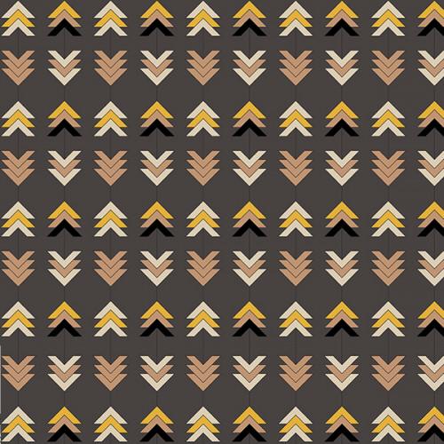 Tejido techno peach (neopreno) gris bielástico de tacto suave con estampado geométrico en negro, camel y amarillo