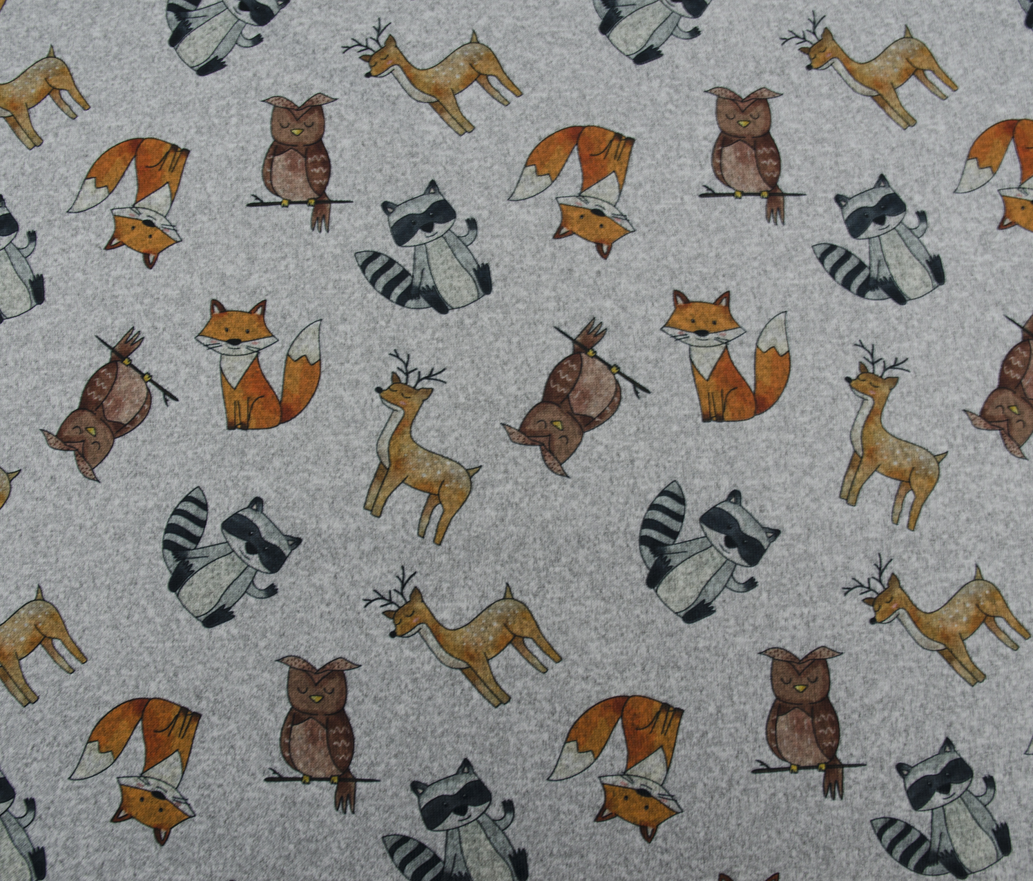Tejido levemente elástico, piloso por el derecho, y liso por el revés. Tiene una superficie mullida, tacto suave y blando y protege el cuerpo con su gran calidez y poder absorbente. Estampado de animalitos: zorros, mapaches, ciervos y búhos.