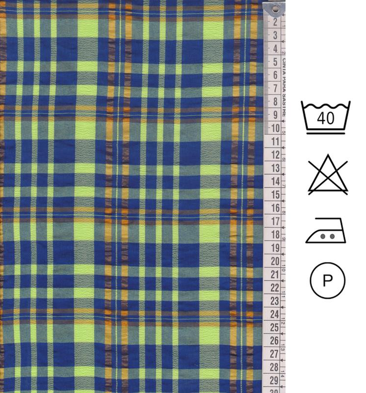 • Madrás escocés fondo verde lima con líneas azules y ocres formando cuadros.
