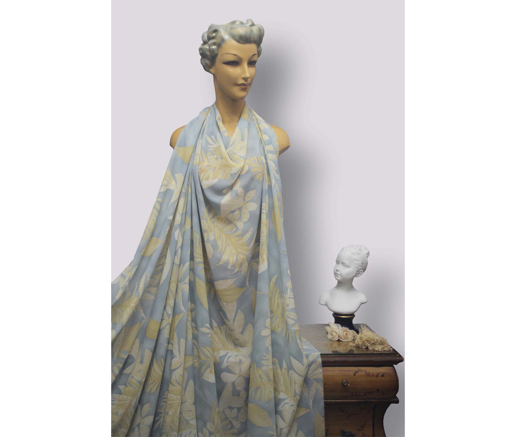 • Crepé celeste grisáceo estampado con hojas de palmera vainilla y beige