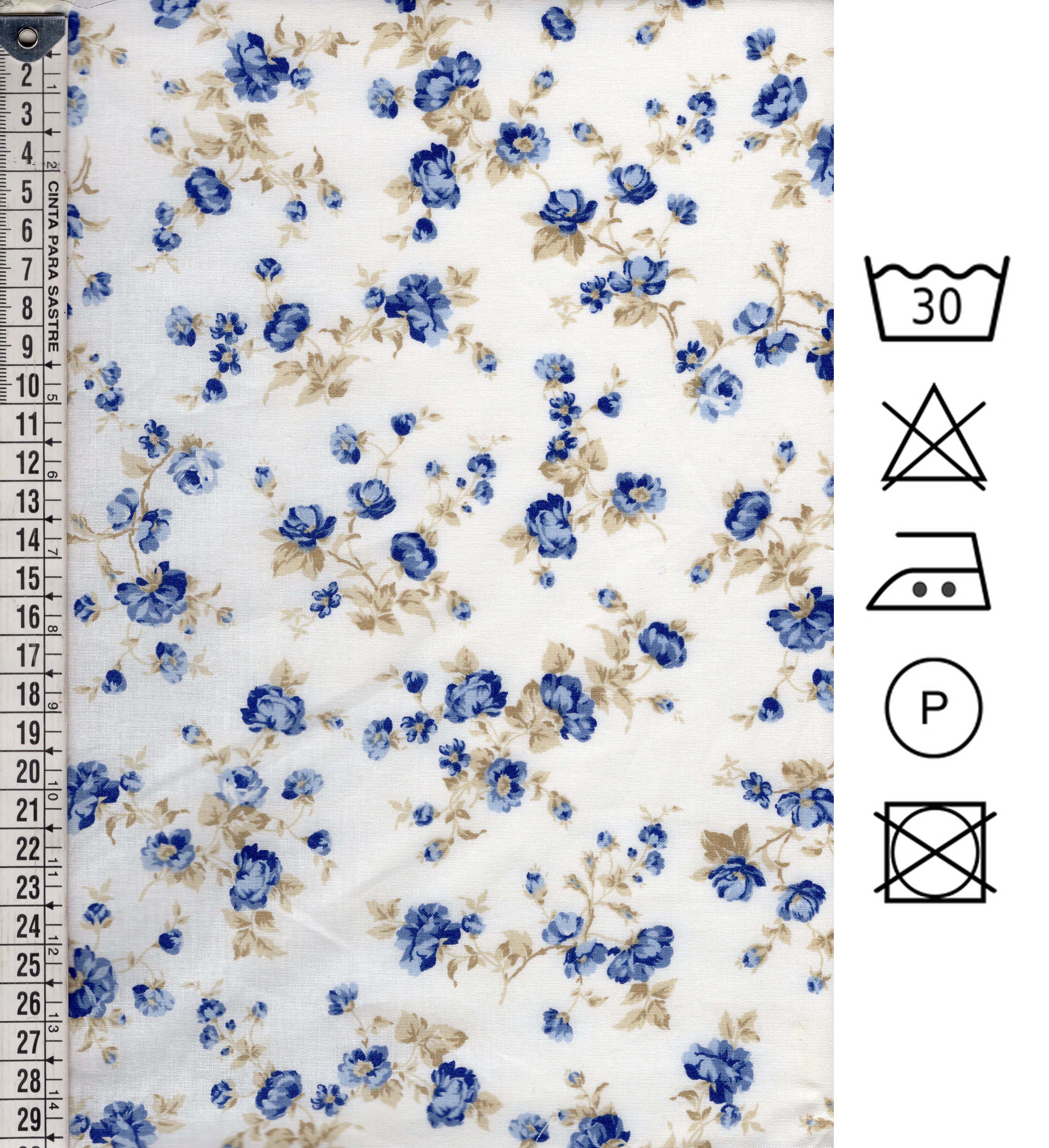 Tejido de popelín de algodón de fondo blanco estampado con florecillas en tonos de azul con tallos y hojas en tonos marrón.