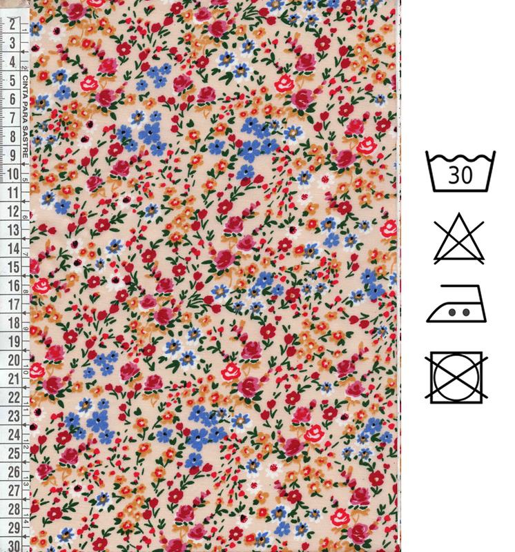 Tejido con estampación de florecitas de varios colores sobre fondo salmón claro.