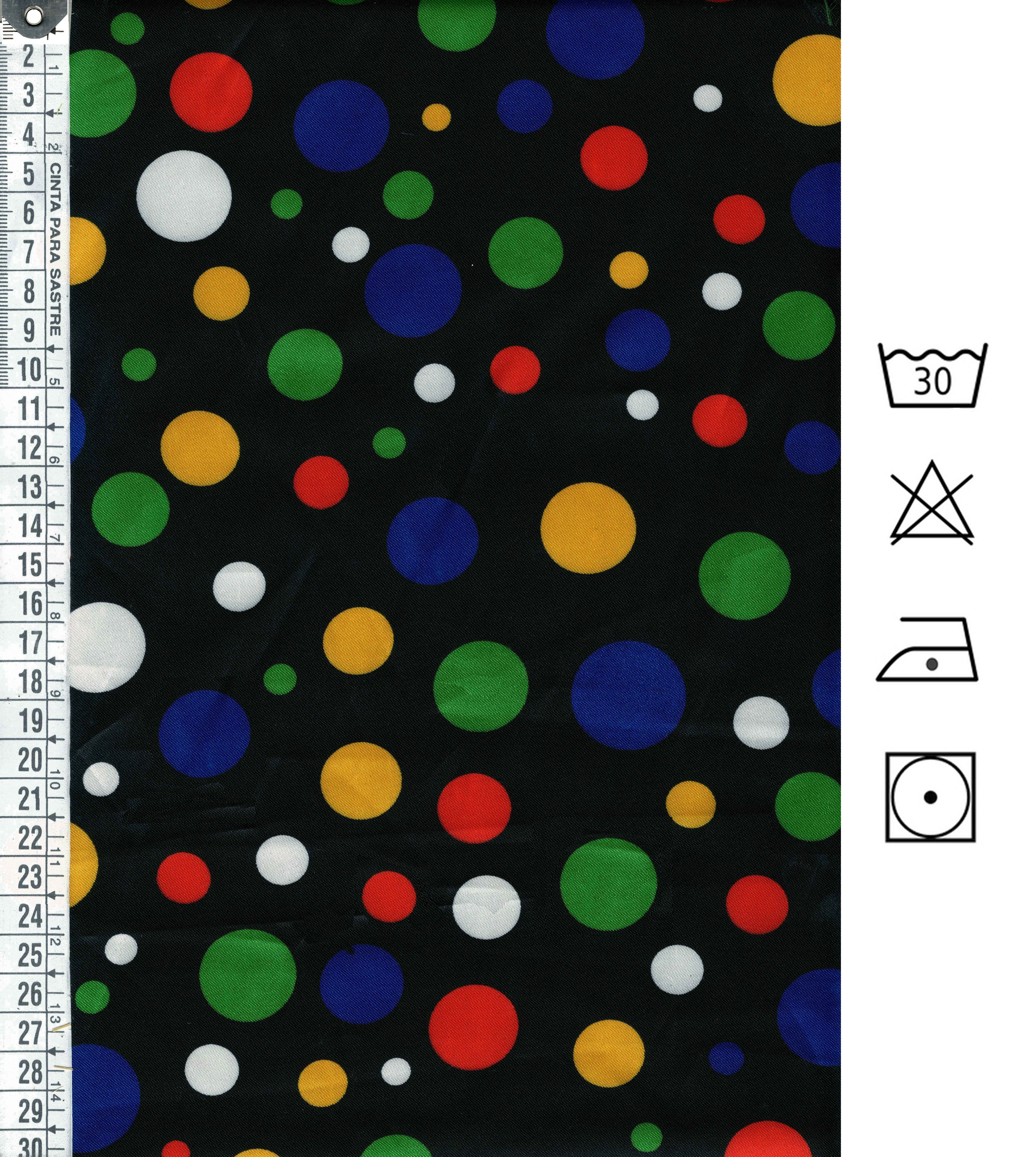 Tejido de raso negro con estampación de lunares de varios colores y tamaños.Apropiado para disfraz y Carnaval