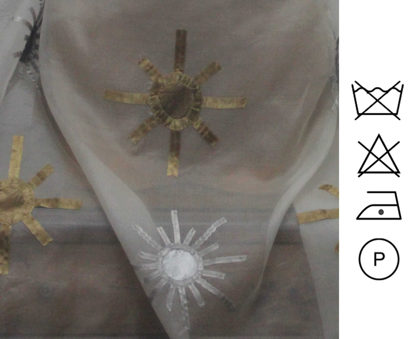 • Organza de seda natural color crudo bordado a mano con aplicaciones de soles oro y plata en raso. (Tejido exclusivo)