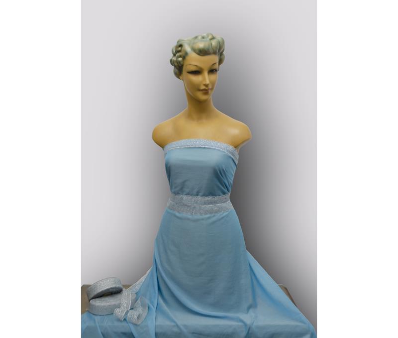 Tejido mate muy fino y ligero, semitransparente. Por su liviandad, produce la sensación de no llevar nada. Apropiado para confección de vestidos, camisas, echarpes, foulards, envoltura de objetos preciosos... El complemento es una puntilla de encaje en color plata, ref. COM-0052