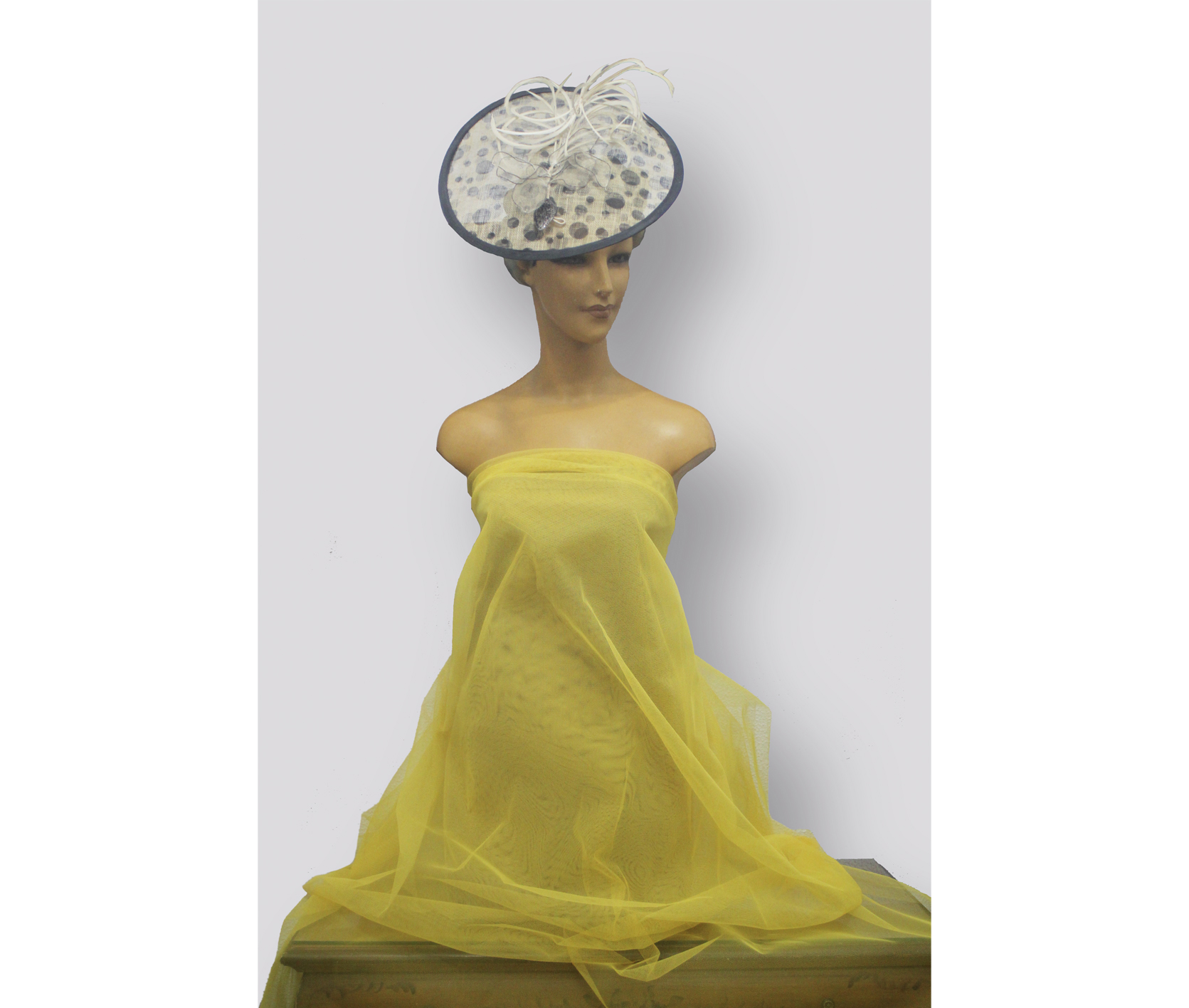 Retícula regular de hilos muy finos, ligeramente elástico y con mucho apresto. Adecuado para tu-tú de ballet, vestidos de moda, enaguas, lazos, tocados, velos, decoración, disfraces... La pamela está realizada por el sombrerero y peluquero José María Galván.